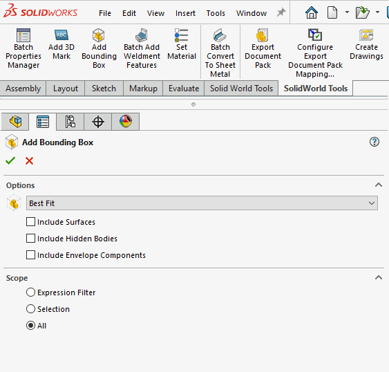 Add Bounding Box ukaz je na voljo v okolju sklopa in kosa ter omogoča vstavitev t.i. Bounding Box gradnika v vse komponente izbrane v Scope razdelku.