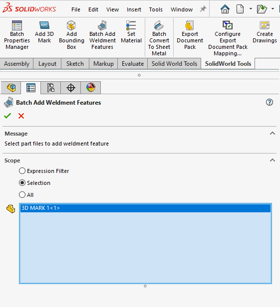 Uporabnik v razdelku Scope izbere komponente katerim bo dodan Weldment gradnik in SolidWorld Tools dodatek jih bo posamično obdelal.