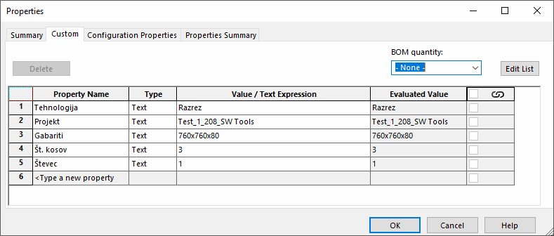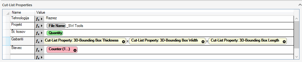Razdelek Cut-List Properties nam omogoča podobno le,da lahko v isti operaciji hkrati dodamo določene lastnosti posameznemu telesu,če v Scope razdelku izbrane komponente vsebujejo več teles (t.i. Multibody).